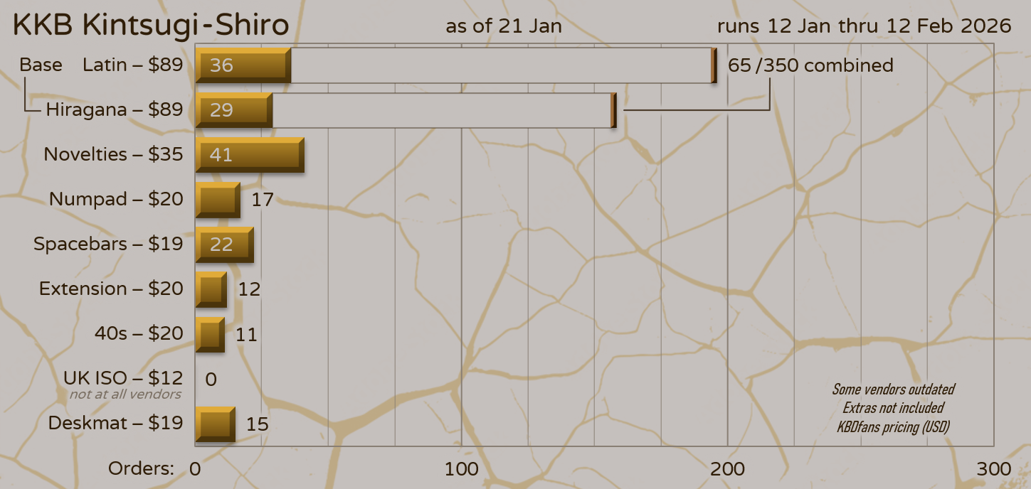 Edit: added current GMK CYL BoW in-stock kits for comparisonFor example, the current CYL BoW set offers a French child kit. Looking at 21 previous KAT group buys, 20 offered French kits. On average their orders were 2.2% of Base kit orders. All 21 group buys offered Colevrak kits, and on average their orders were 3.7% of Base kit orders.