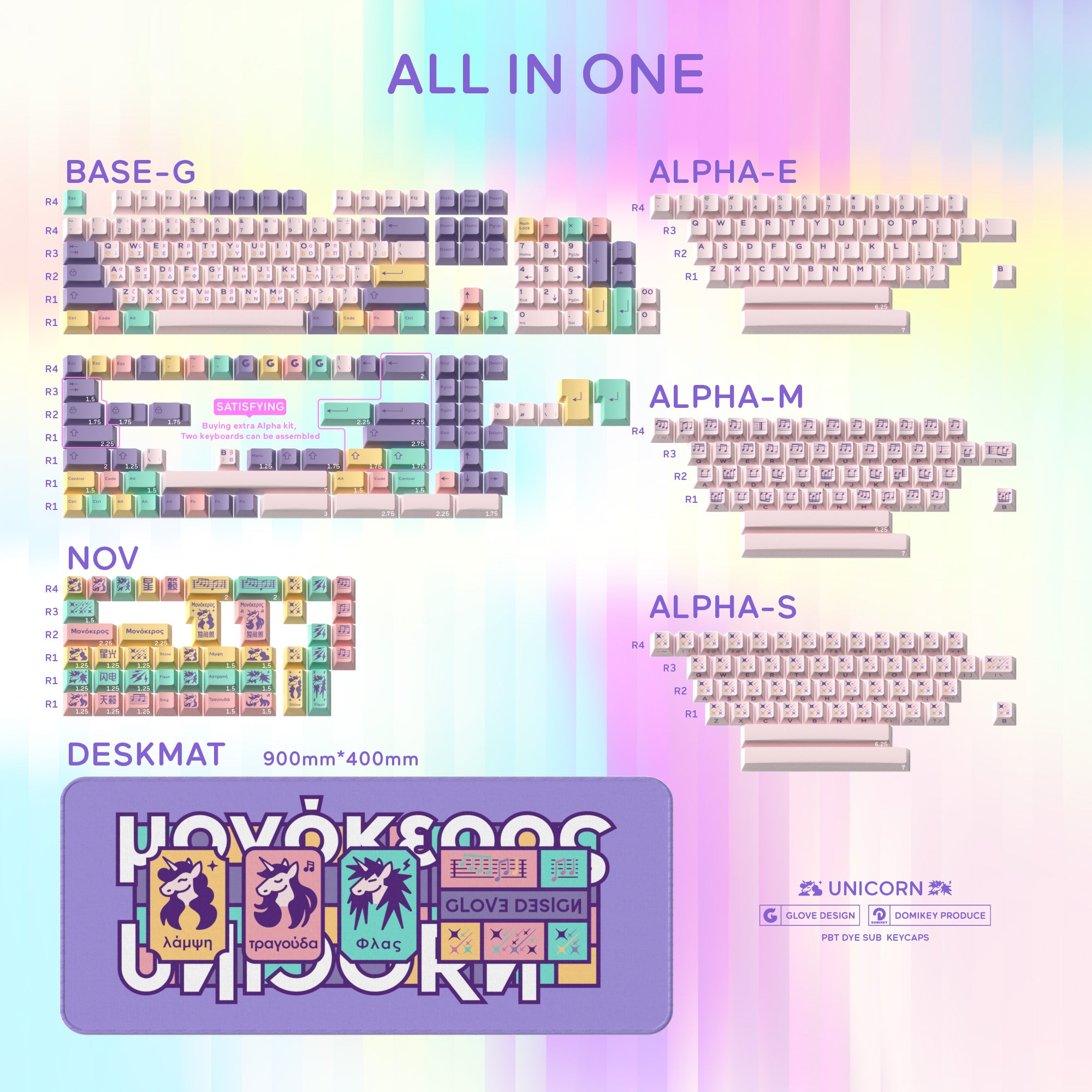 In order to exhibit the 3 stars, GLVOE and Domikey try best to deeply develop the advantage of dye sublimation technique so that the colour of keycaps can exhibit the characteristics of the Unicorn Band.