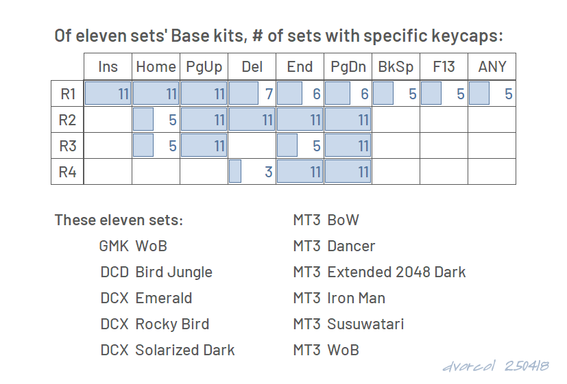 Ha ha! No, I actually DID mean R3. I am a long-time full-sized keyboard user, and Linux professional over years of IT and development. Also a recent convert to the 65% layout. I use the Del key a lot...a lot. And from all my time with a full layout, Del has to be at R2. After Del, the things I use most are Home and End. On the command line all day, and often running long commands that I need to edit to find exactly the right one, Home and End take me to the beginning and end of a line, respectively. A huge help. In the event of using a 65% board that wastes the top right R1 with a silly badge, I want Home to go somewhere. The best spot, IMO, is R3. I use Home at layer0, with End at layer1. When I can't use Home at R1, and a keycap doesn't exist for R3 (it almost never does, which sucks), I'll _take_ PgUp/PgDn at R3, but I don't use those nearly as much. But my mild(?) OCD makes me want PgUp (which is hit and miss to be included at all, which also sucks) to be the key in that position, with PgDn at layer1. Having PgDn there because PgUp wasn't included grates on me. And while we're at it, I guess, I _really_ wish there was always a 1.5U R4 Fn key included. I prefer the Tsangan bottom row, and will use it whenever the PCB allows it. The left three keys in that row being Ctl, Super, and Alt, I really want the right 1.5U key to be Fn. I don't need another Ctl or Alt, and again with the OCD thing, I don't want to use Super there since there's already a key labeled Super with a different function on the left. GMK has the mold for the 1.5U Fn key. I really wish designers would incorporate that into their designs. And you might ask why I don't just use Fn right above the right arrow. I will, if I have to, but I'd much rather have a dedicated End key there , rather than having End at layer1 of the Home key. And Fn is WAY more comfortable as the right key in a Tsangan bottom row.