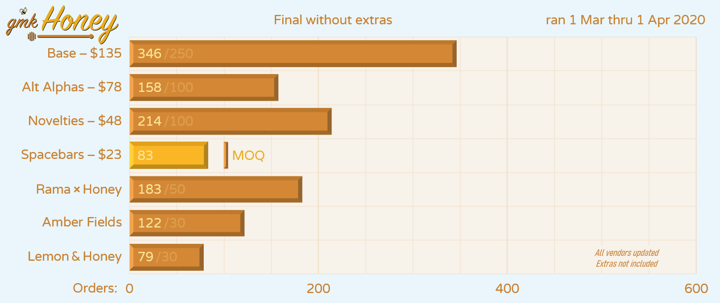 Honey captures the versatility we were looking for; the versatility to treat wounds for the Egyptians, preserve seeds for the Greek, flavor tea for our mornings, and provide a theme for this unique keycap set.