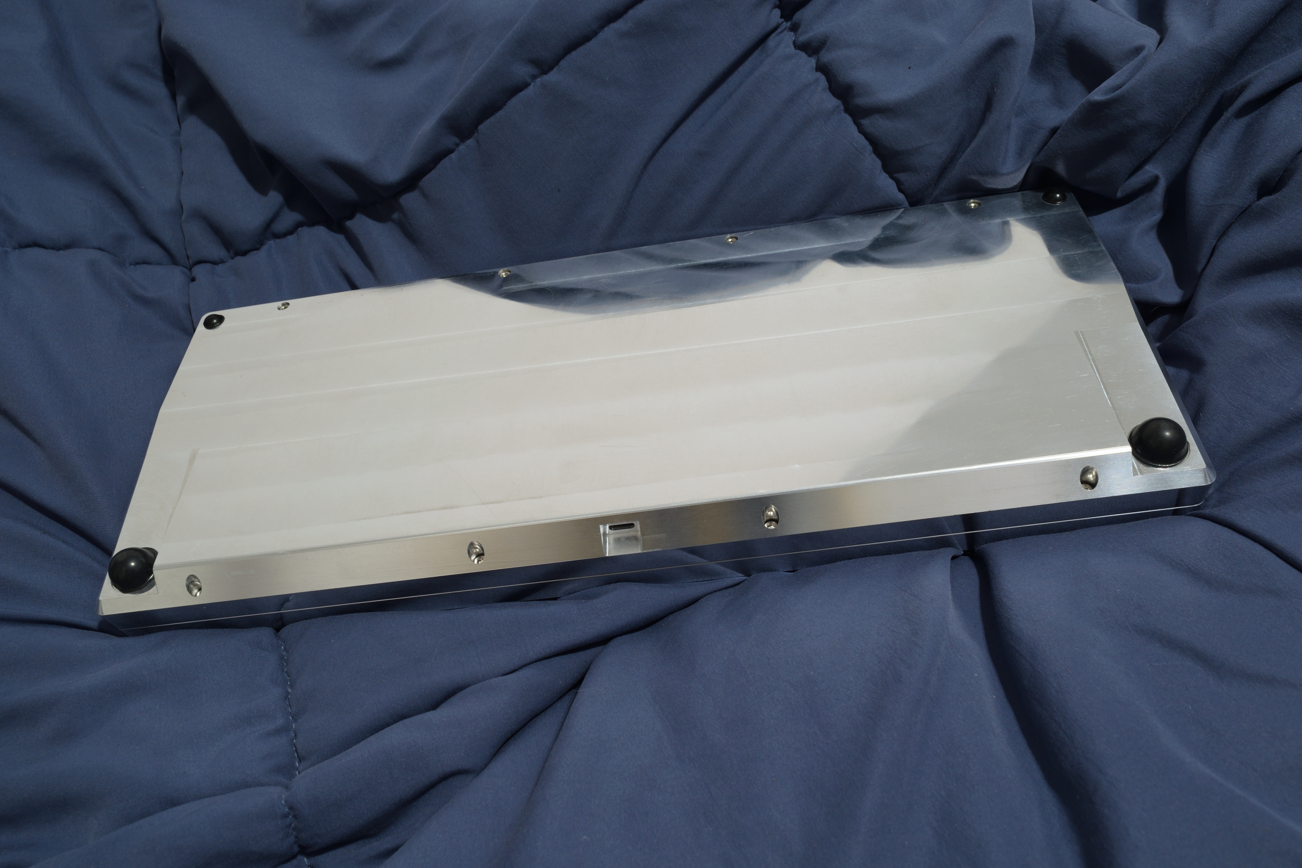 I intentionally didn't go for a typical wedge shape on either the bottom piece or the case overall because wedges are relatively expensive to machine. To machine a wedge well, you either need to do machine it on a 5-axis CNC, or a 3-axis with custom angled fixturing, which for a keyboard of this size is not cheap (and would have resulted in significantly more expensive prototypes). If you have holes going in at only one angle you could do 3D-profiling on a 3-axis (which takes a lots of machine time if you want an okay finish), but as soon as you have holes or pockets coming in at 2 different angles (e.g. a pocket for your bumpons parallel to the desk and a set of holes parallel to the plate to attach the plate) you need to do either the 5-axis or the custom fixturing. Both cost quite a bit more than typical 3-axis CNC machining.