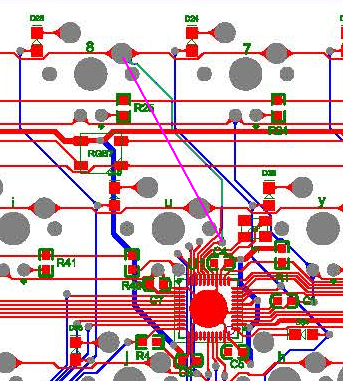 So I connected the yellow dots, and the keys in the top row didn't respond. When I connect the pink dots, it triggers the entire column, ie. "7YHN".