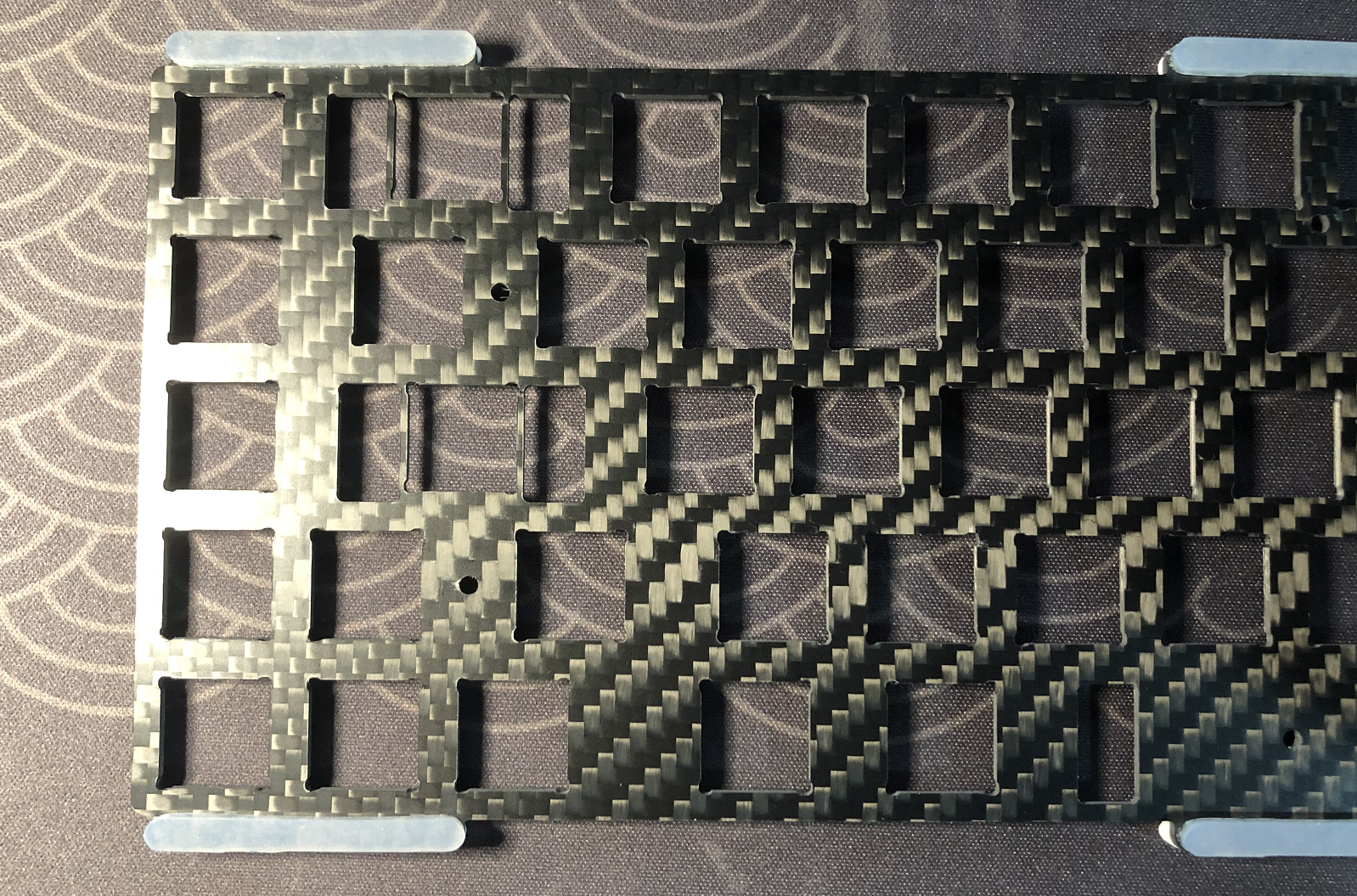Plate locates between second and fifth layer, supported by 12 silicone and EVA gaskets which are taped to the plate itself. The plate is completely hidden from all 4 sides of the case, giving the user the freedom to customize case color scheme.