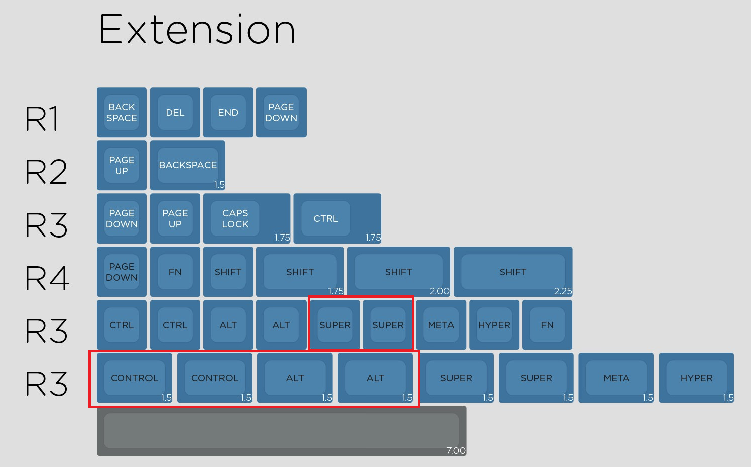4. Few specific caps from SA Symbiosis (or 7bit's round6) to cover Tsangan bottom row: 2x 1.5u CTRL, 2x 1.5u ALT or ALT GRAPH, 2x 1u Win or Sys or Fun or anything there was from row3 1u cap, like on the photo below