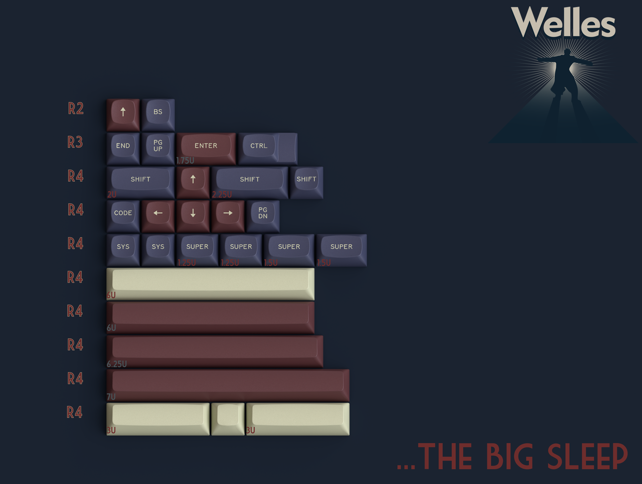 ...The Big Sleep- Extension KitExtension kit, featuring accent bars, "good to haves," 6u HHKB support, text supers for those who can't stand a single symbol, and 12u 40s support.