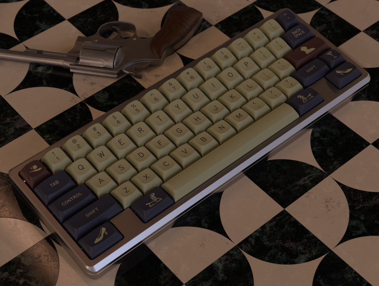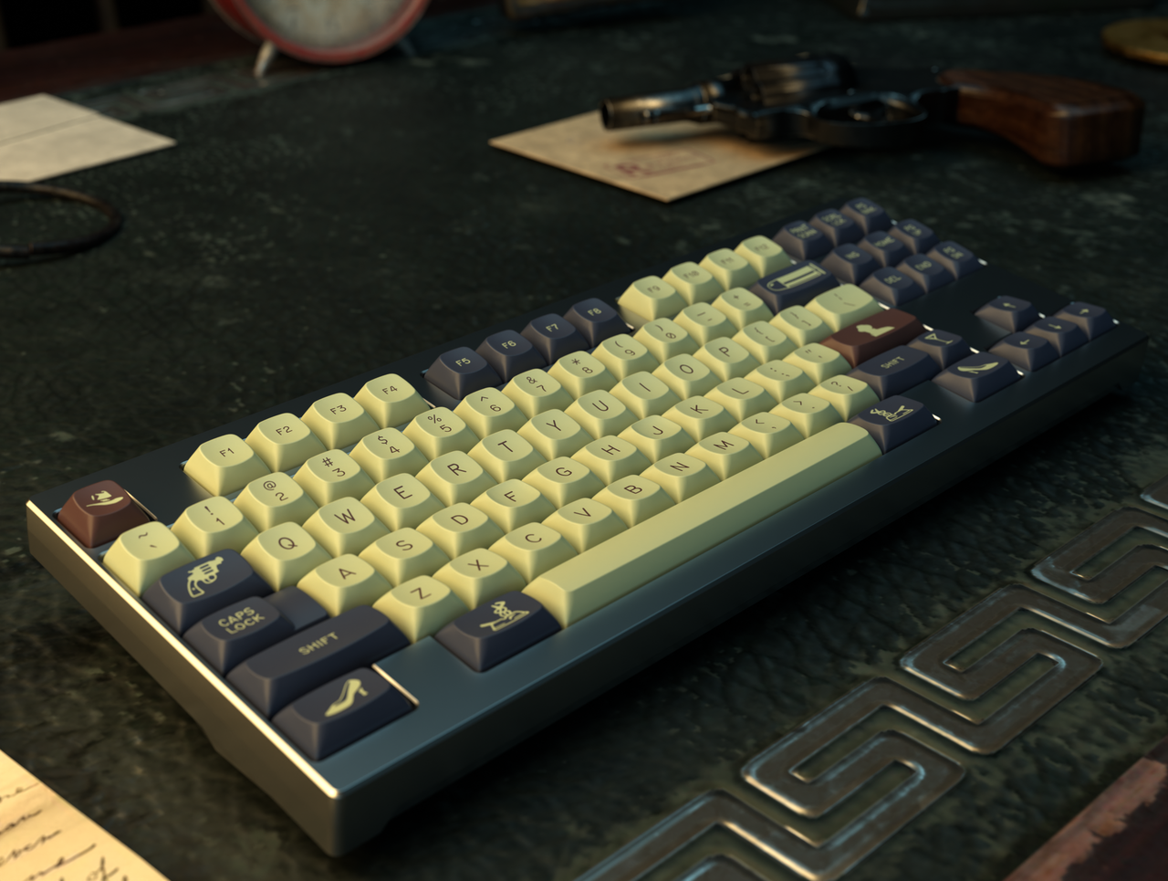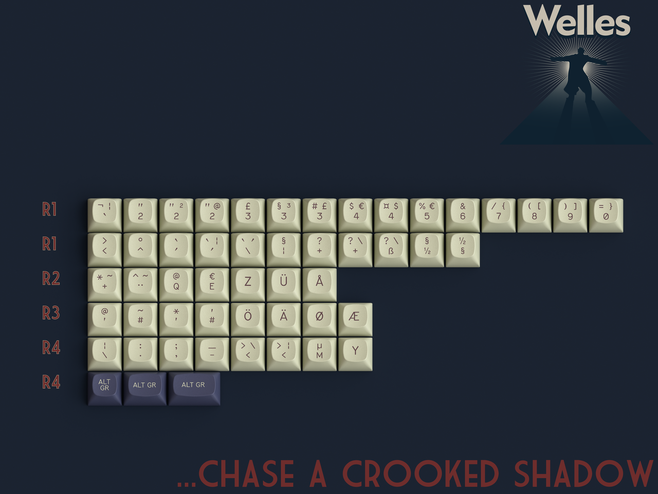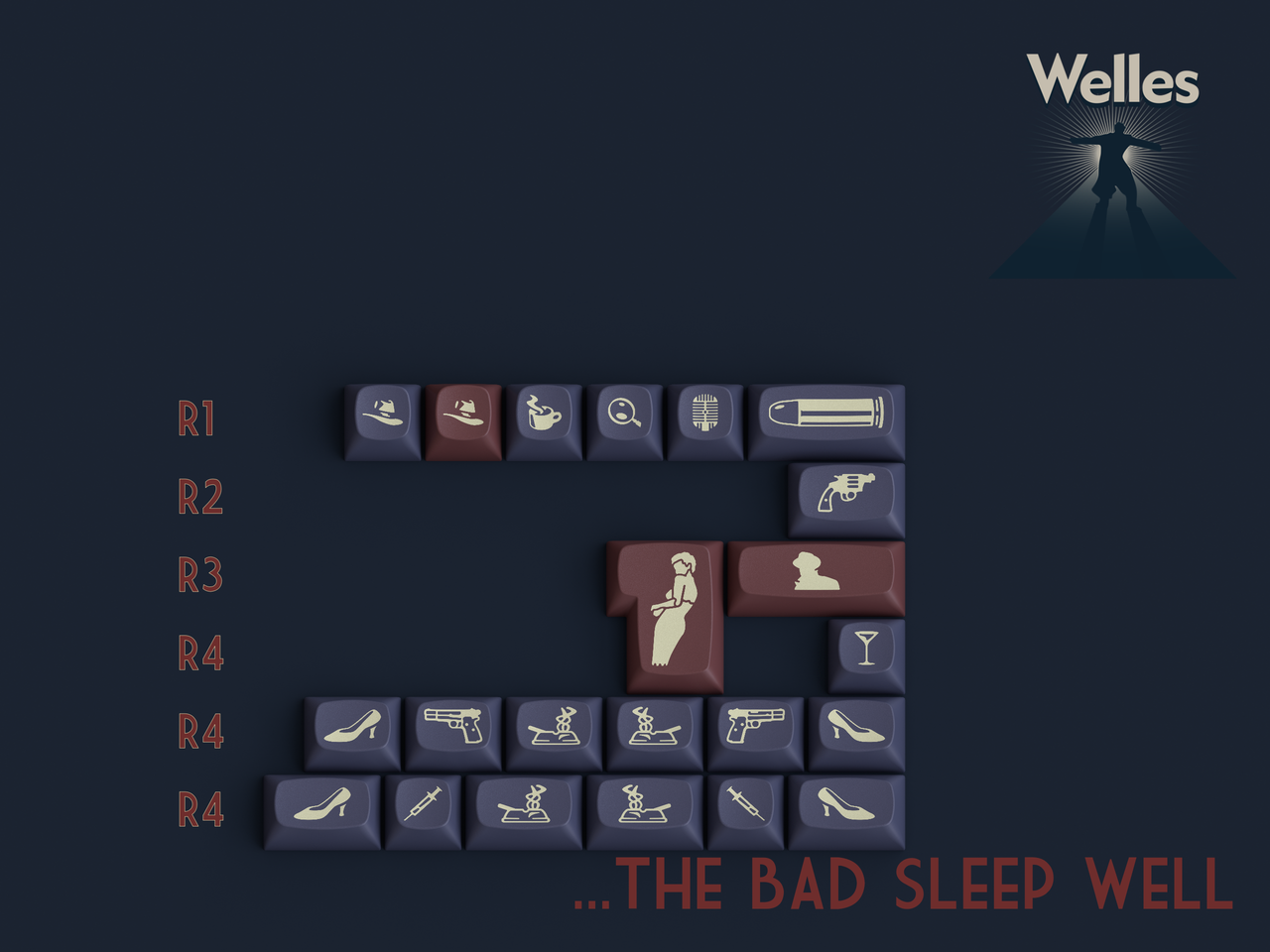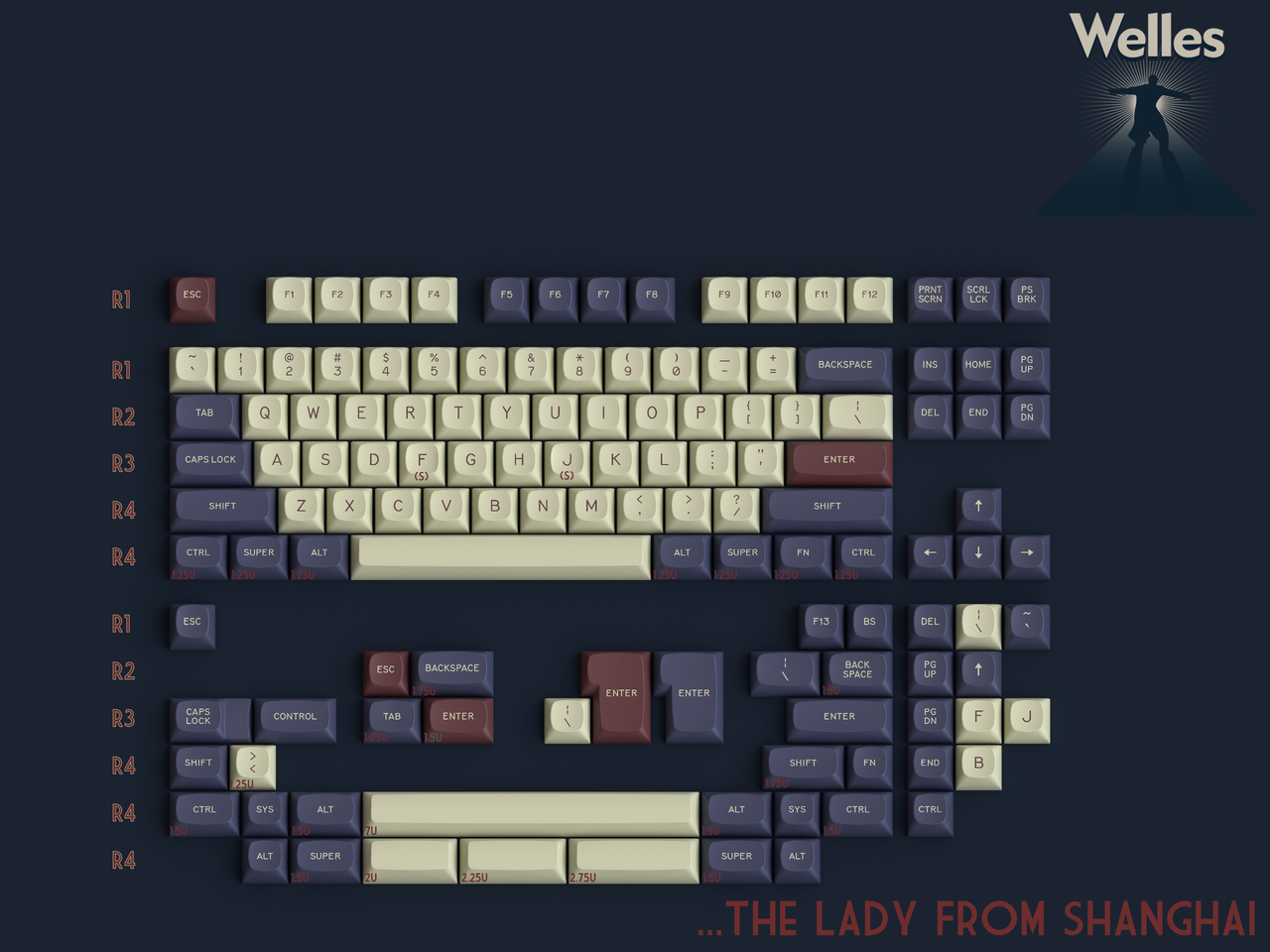 So when you press these keys, know you’re not just typing. You’re telling a story.Kitting...The Lady From Shanghai- Base KitNamed after the 1947 Welles project starring Rita Hayworth, this set is designed to accommodate most popular keyboards between 60 percent and full size. It also features limited ergo and minivan support. Slimmed down from previous iterations to make the set more accessible. Everything taken out of here is in the new extension set.