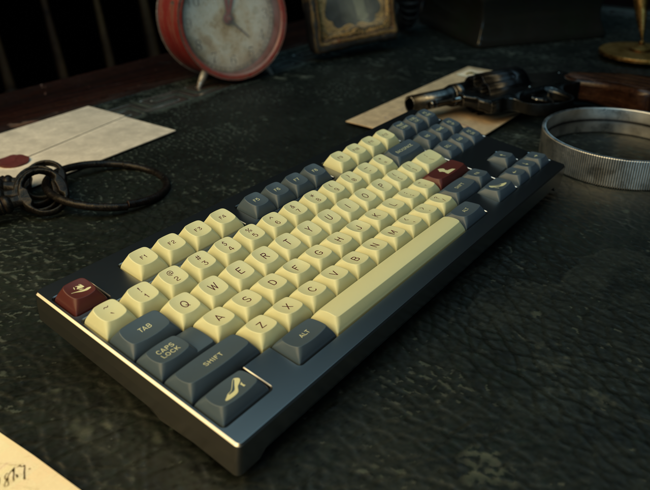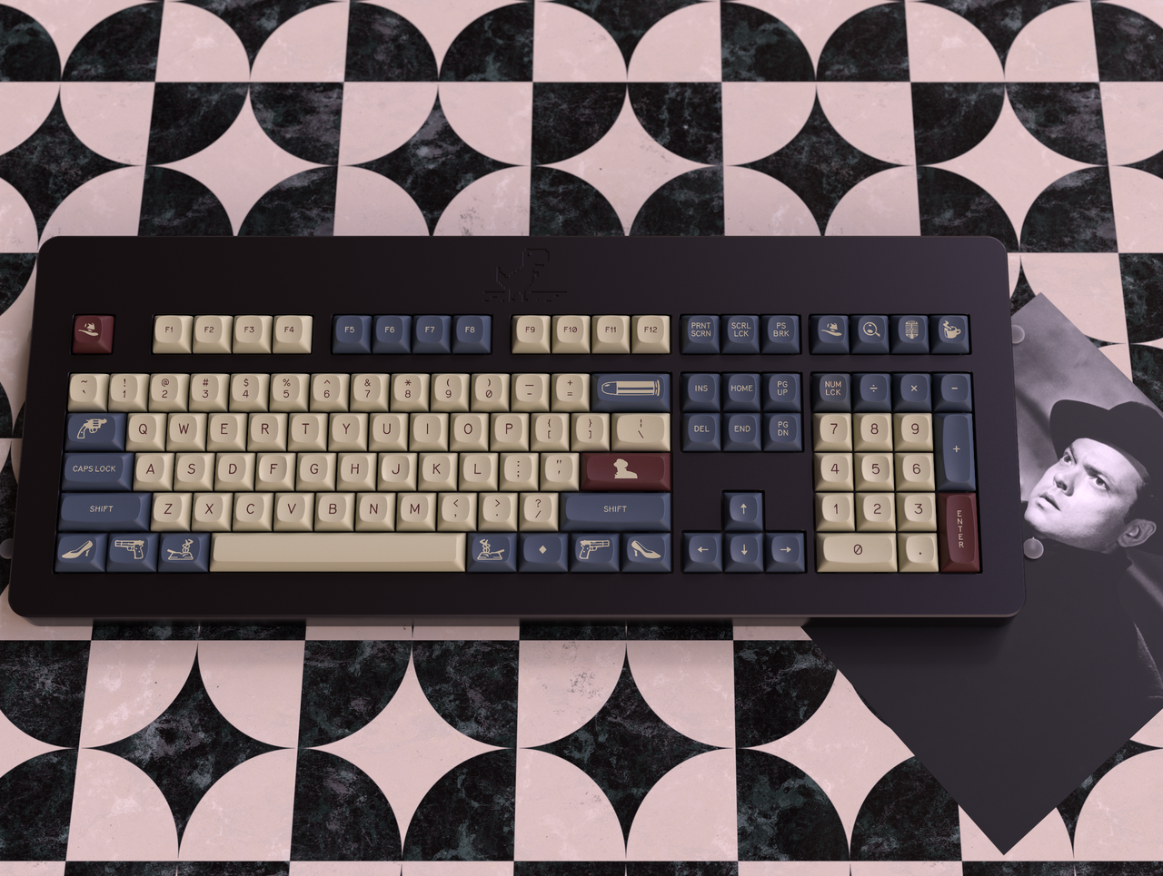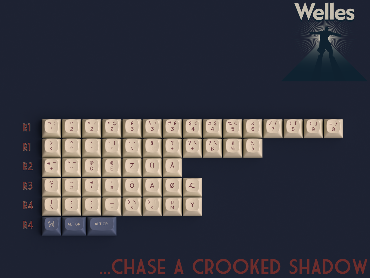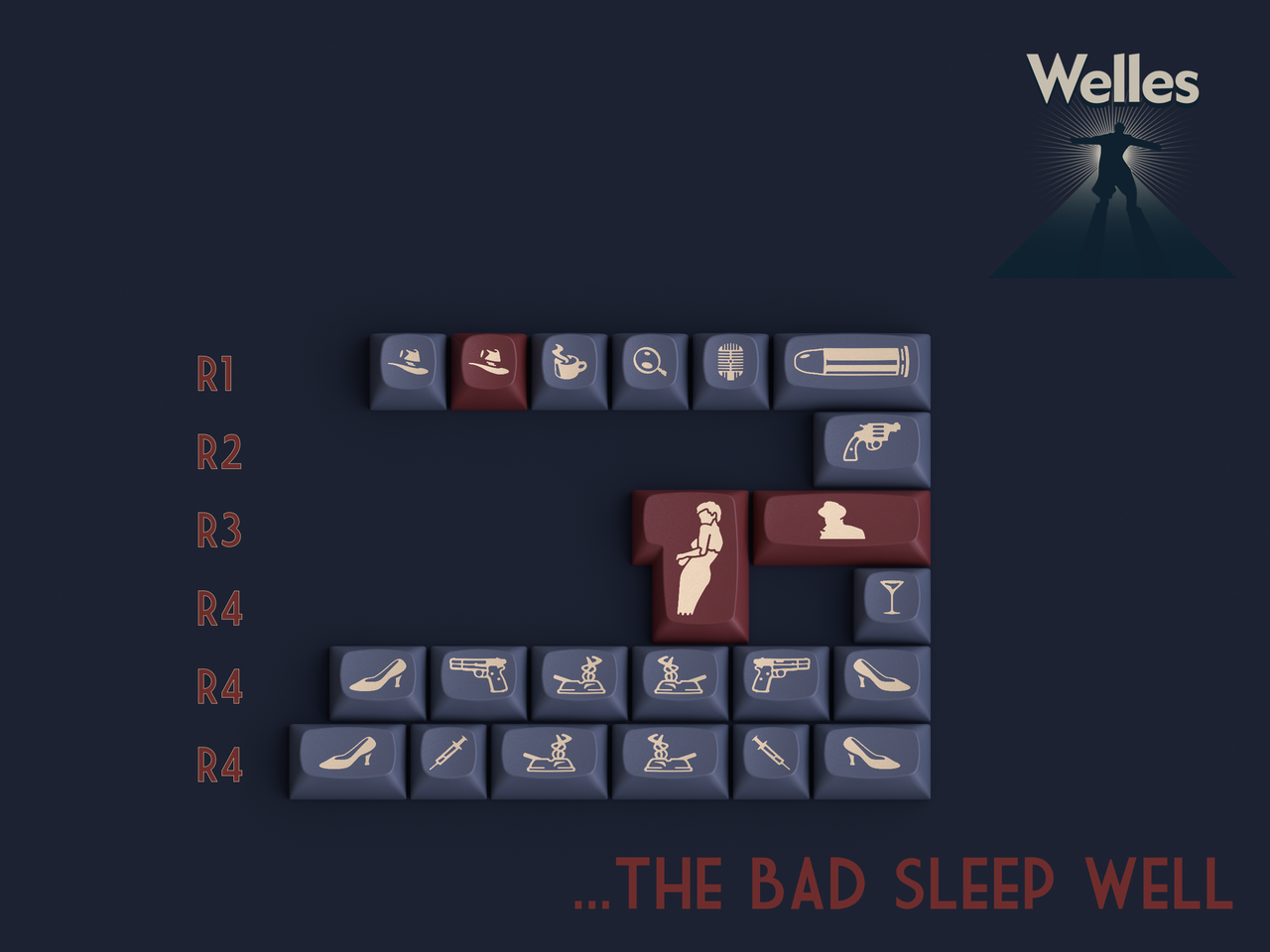 So when you press these keys, know you’re not just typing. You’re telling a story.Kitting...The Lady From Shanghai- Base KitNamed after the 1947 Welles project starring Rita Hayworth, this set is designed to accommodate most popular keyboards between 60 percent and full size. It also features limited ergo and minivan support. Slimmed down from previous iterations to make the set more accessible. Everything taken out of here is in the new extension set.