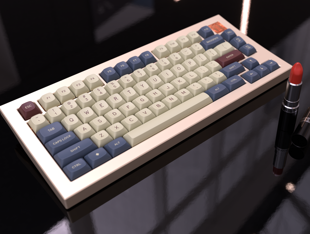 I have received samples from GMK and updated all renders to match the colors. The most significant change was in the red, which went from more of a darker red to a kind of desaturated "brick red," which I think fits the theme much better.