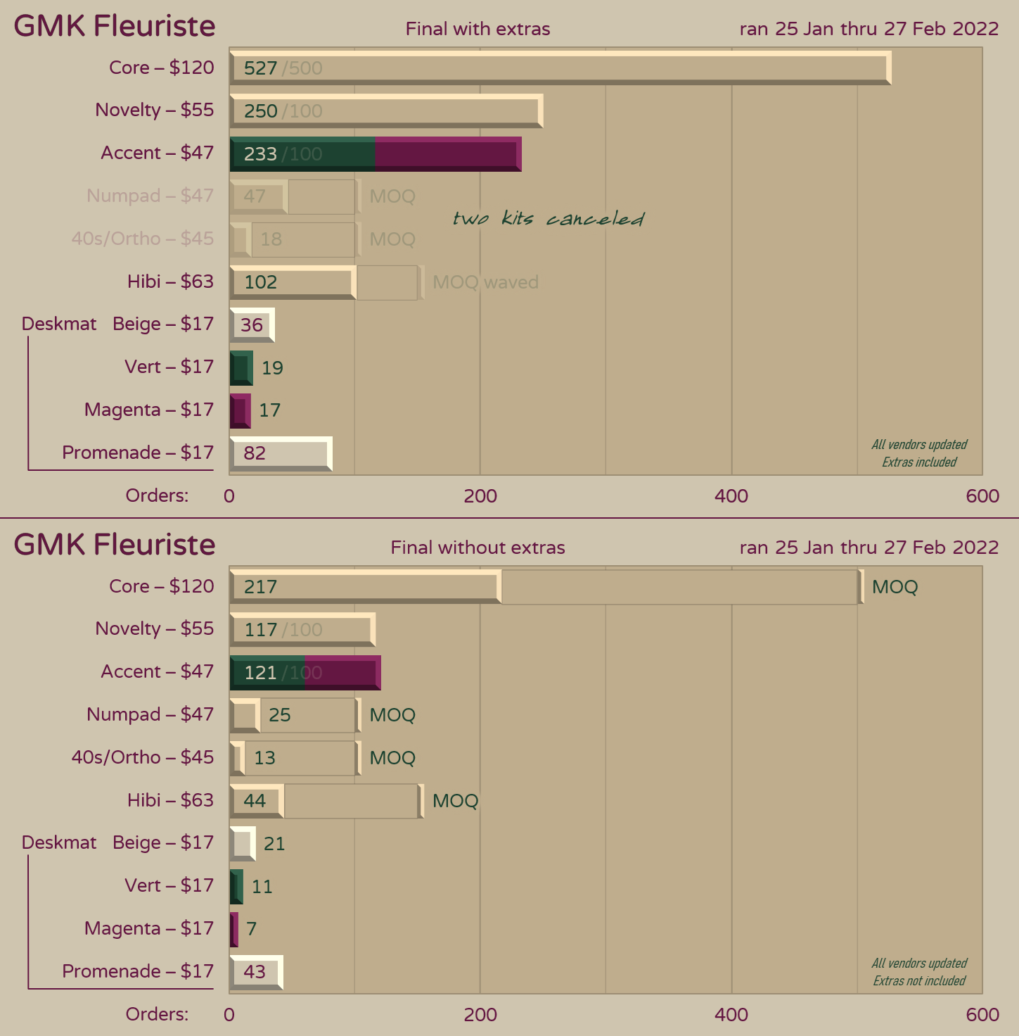 Kit content details beyond Full vs TKL are not considered at all. Zero, zilch, zip, nada, nothing. In reality, for some sets the TKL kit has more small bars, or novelties, or 40s mods, or UK ISO, etc. that would bloat a Full Base kit. For other sets this is not the case. Some Numpad kits have additional keys that don't fit in a Full Base kit, but others are bare-bones. And some Full kits are fuller than others. I'm ignoring a lot of other set-to-set variables too: number of stock and custom colors, MOQs, sales margins, GB dates, etc.
