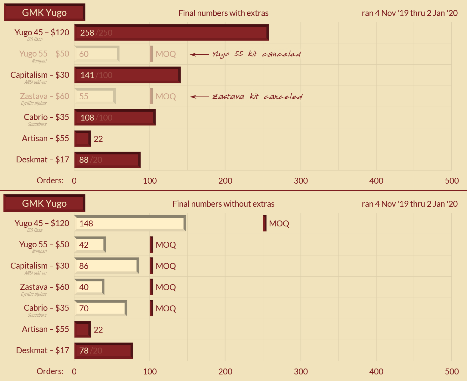 I'm ignoring a lot of other set-to-set variables too: number of stock and custom colors, MOQs, sales margins, GB dates, etc.