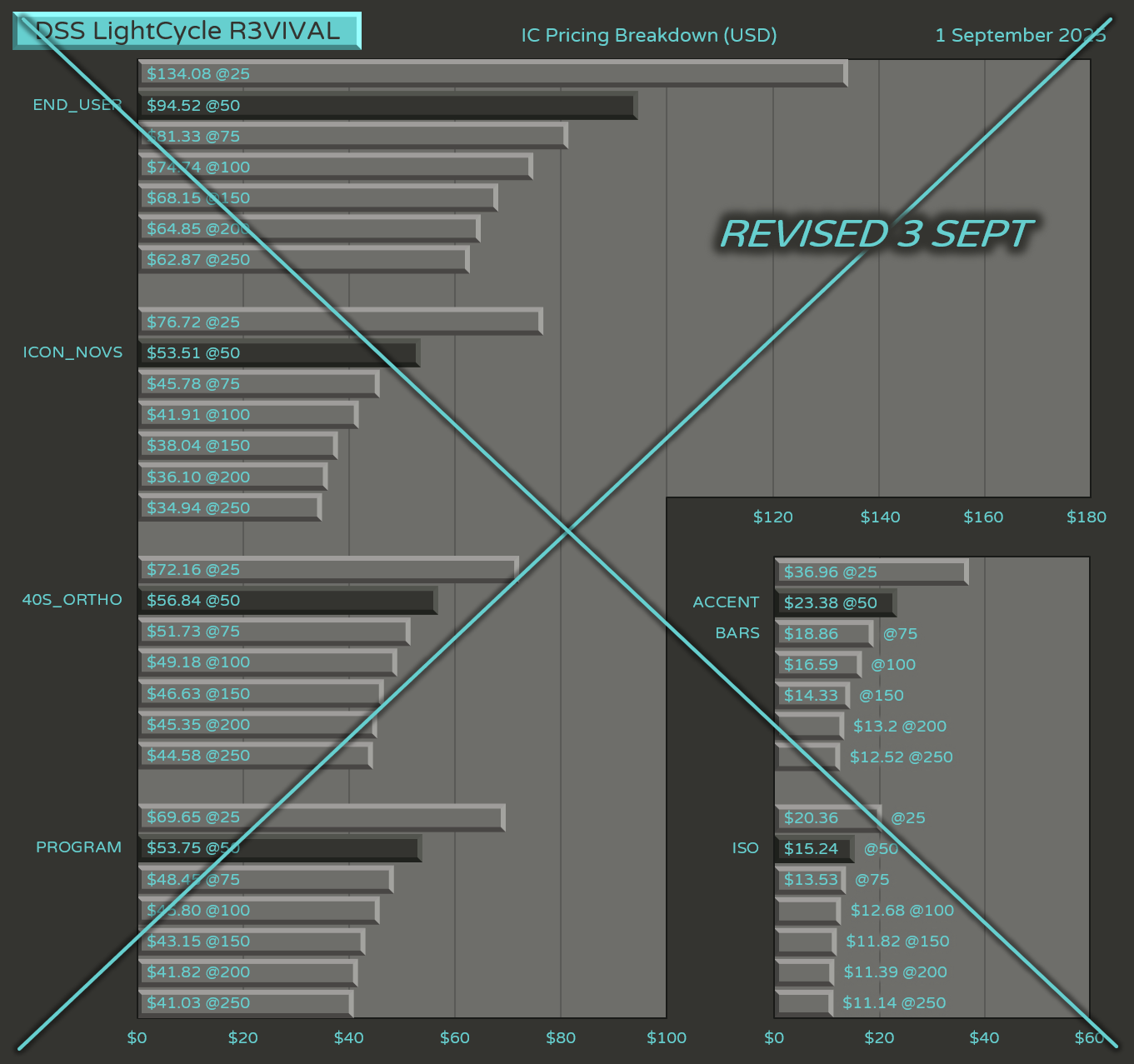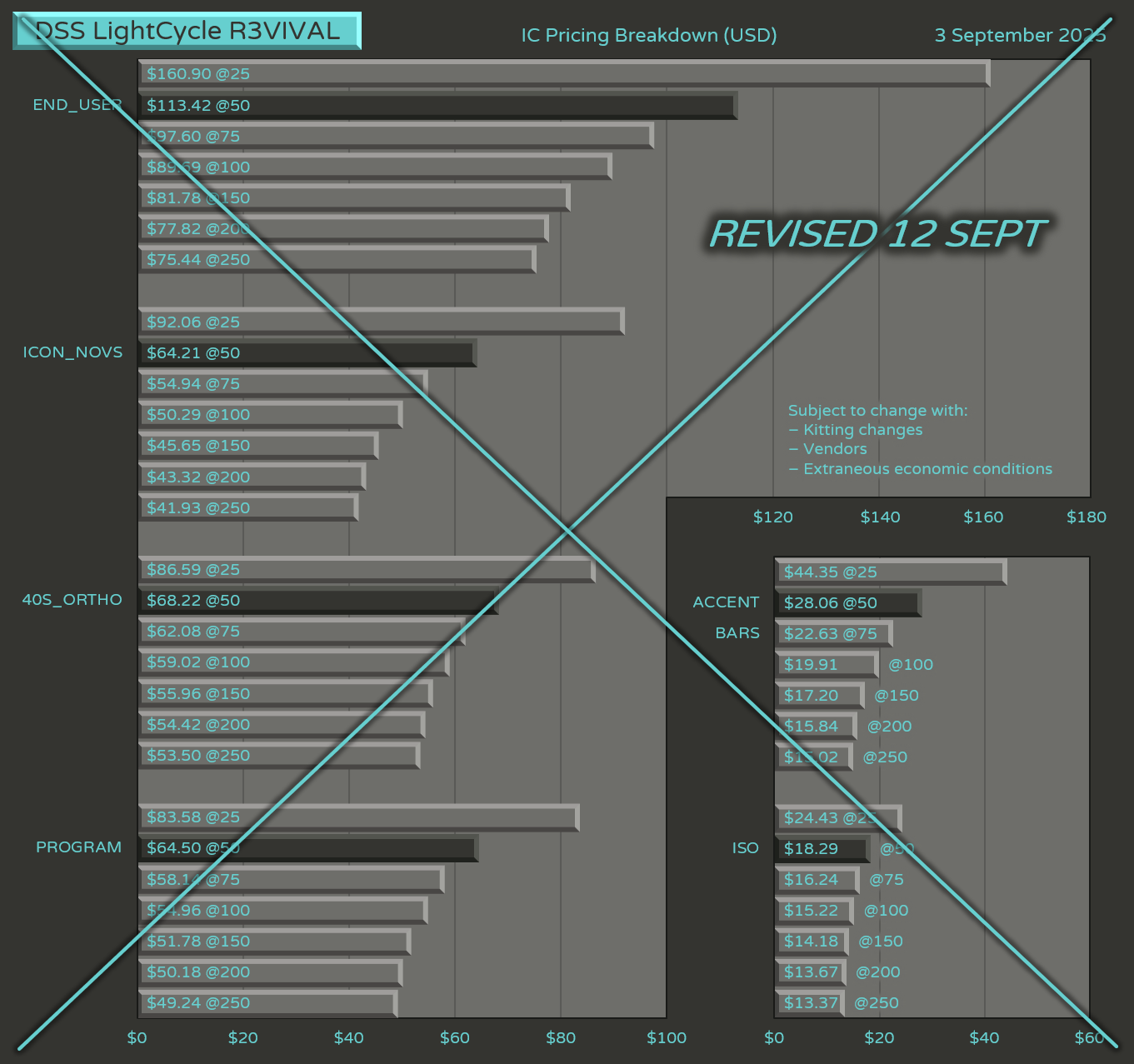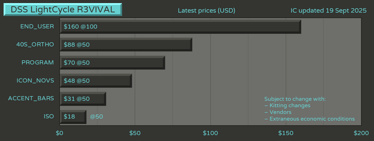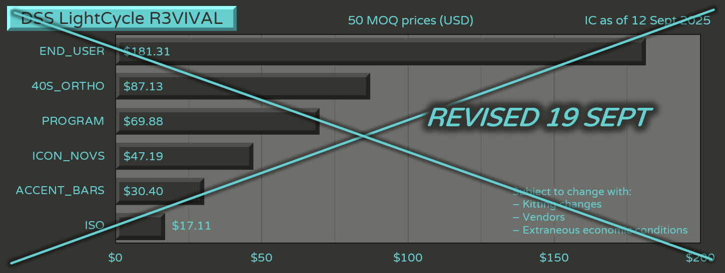 Base Kit speculatively priced at USD $160 at 100 MOQ based on SP Quotes, inclusive of new legends