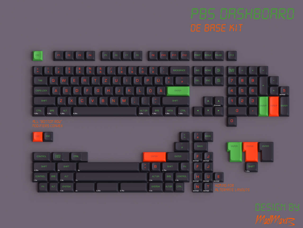 Even though this set was popular during its interest check as an MTNU set, it failed to attract a US Vendor. After using PBS Aperture, I thought PBS would be a nice pair for the overall "look" of Dashboard. Furthermore, PBS is dyesub, which allowed for more customization of the design typeface and more colorful novelties.  I am proud to present the PBS Dashboard. If you like this set, please fill out the interest check