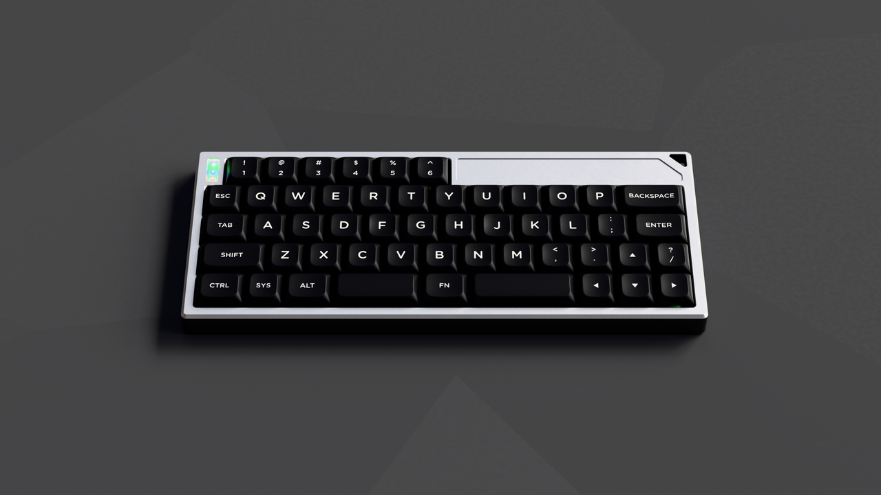 The Bullet Train looks quite simple at first glance - but has a few aesthetic features I wanted to bring attention to. The board is flat - 0 degrees - in order to keep it as low as possible. But, we wanted high-profile bezels, so the gaps between switch and keycaps will not be visible. The bezels are pretty thin - again in an effort to keep it sleek and portable. The top left of the board features a PC diffuser for RGB status indicators.