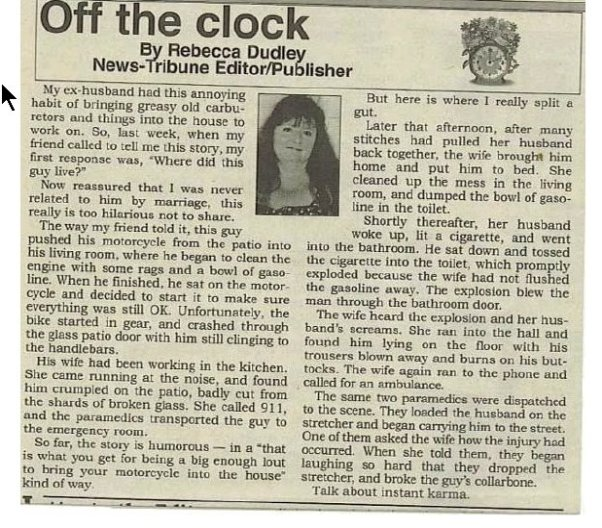 The following quotes were taken from the Toronto News, July 26, 1977, and are actual statements found on insurance forms where car drivers attempted to summarize the details of an accident in the fewest words possible.