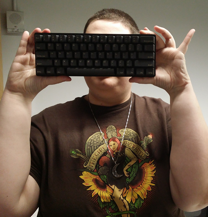 OK, here's that picture I promised of the keyboard that had the misfortune of having me solder most of it. (One key doesn't work but it's the pipe/backslash key which mostly exists to get accidentally hit anyway, I'll see if I can fix it once I get a decent soldering iron now that I'm not as afraid of soldering.)